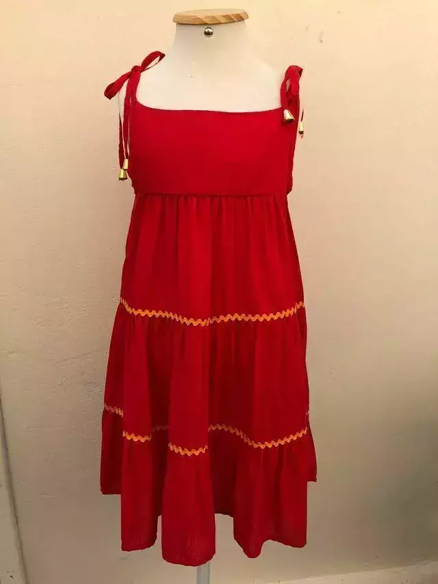 Vestido em viscose vermelho com pompom colorido 374
